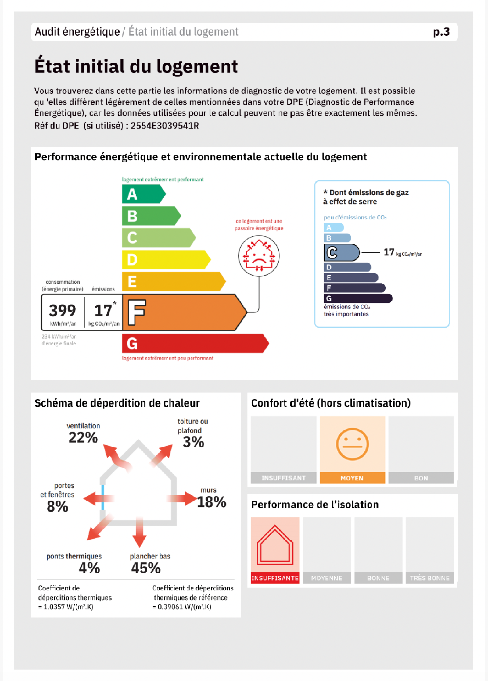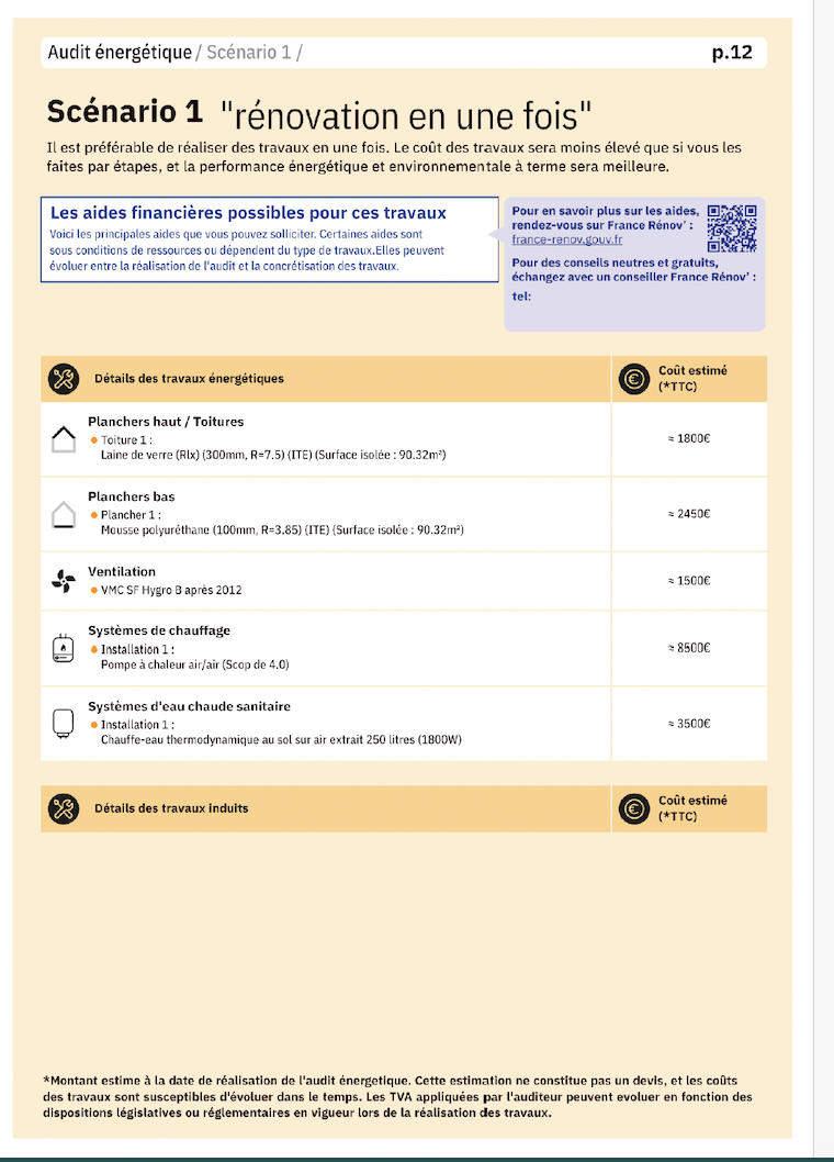 Le DPE actuellement classé F peut être classé C avec la réalisation d'une rénovation du plancher bas pour un cout total estimé à 2450€.